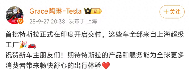 9月27日,特斯拉公司副总裁陶琳告示,印度首批特斯拉Model Y 慎重托福,这批车型一起产自特斯拉上海超等工场。